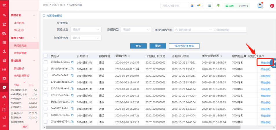 执行质检计划后会生成质检单。管理员可以在待质检列表页面查看分配的质检单。选择一条记录,点击操作列的<开始质检>按钮,就会弹出该通话质检详情页面。
