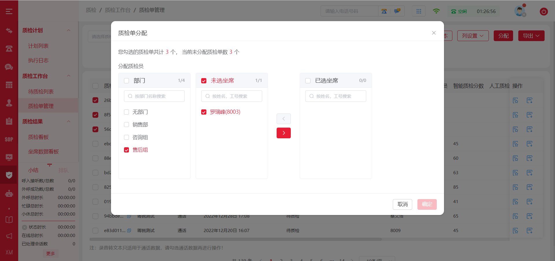 管理员可点击勾选,点击<分配>按钮,将质检单进行分配。