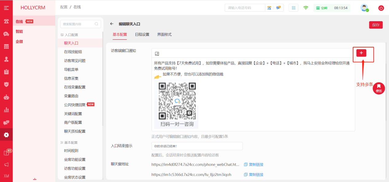 这里需要注意的是,访客端的窗口通知,支持多条且最多可配置5条,配置成功后,窗口消息通知在访客端的聊天顶部进行展示。